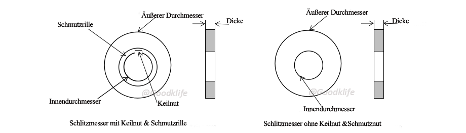 Schlitzmesser mit (ohne) Keilnut und Schmutzrille