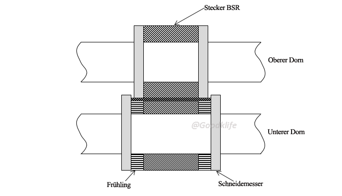 Beispiel: Ein normales Blech mit einer Streifenbreite von 80 und einer Blechdicke von 1,0, die Messerdicke beträgt 10, der horizontale Spalt beträgt 0,1, und die weibliche Einheit = 80 mm, die männliche Einheit = 80 - 10 × 2 - 0,1 × 2 = 59,8 mm.